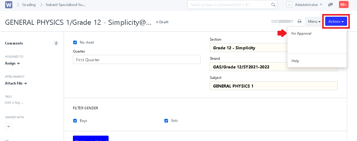 Step 4. Teacher/Instructor will click "Actions" and select "for Approval".