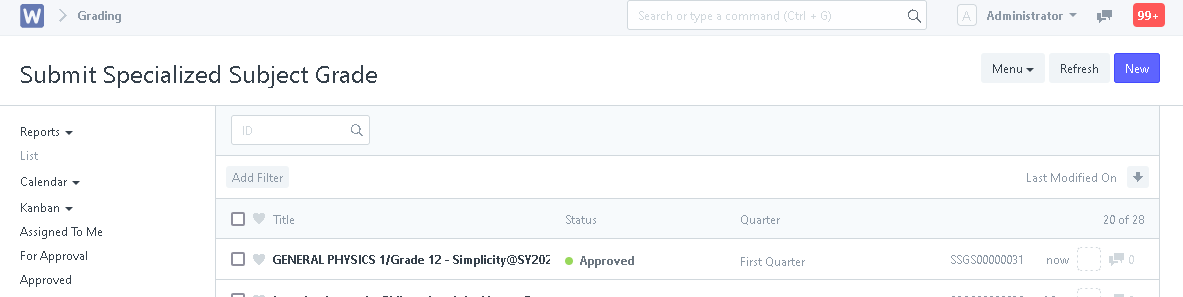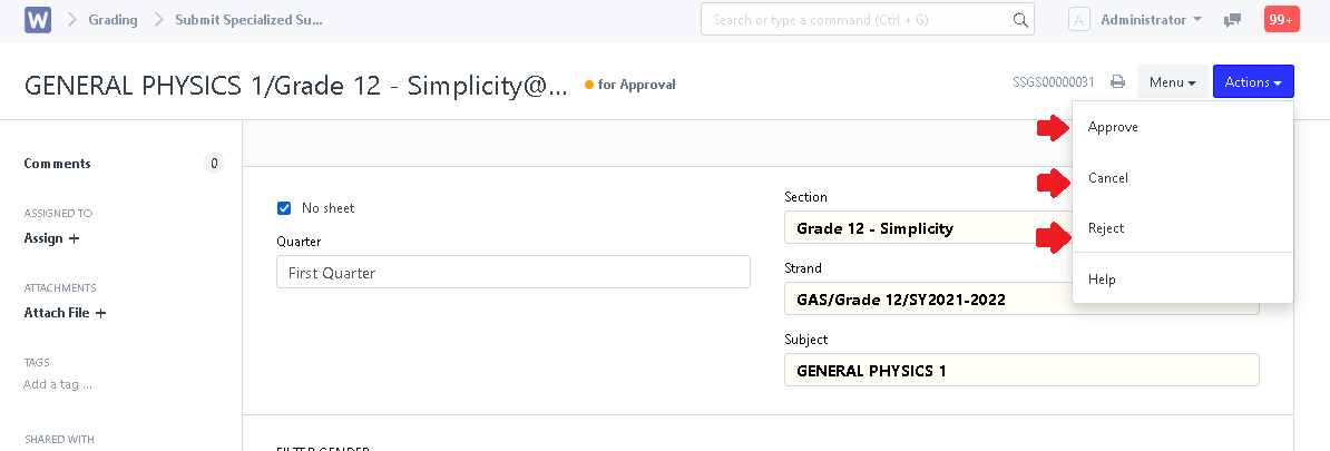 Step 5. After teacher/instructor requests for approval, the Principal will click "Actions" and select to either "Approve", "Cancel" or "Reject".